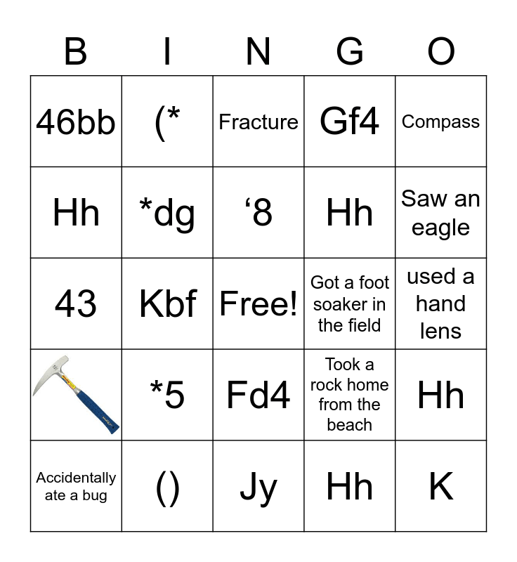 This bingo card has 1 images, a free space and 27 words: Hh, Nbb, Hh, Hh, Hh, Fracture, (*, Got a foot soaker in the field, Accidentally ate a bug, 43, Gf4, (), Jy, Saw an eagle, Compass, *5, *dg, ‘8, Fd4, 46bb, J, K, Kbf, used a hand lens, Took a rock home from the beach, Compass and Granodiorite.