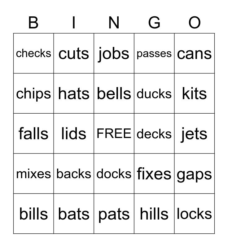 This bingo card has a free space and 24 words: backs, bats, bells, bills, cans, checks, chips, cuts, decks, docks, ducks, falls, fixes, gaps, hats, hills, jets, jobs, kits, lids, locks, mixes, passes and pats.