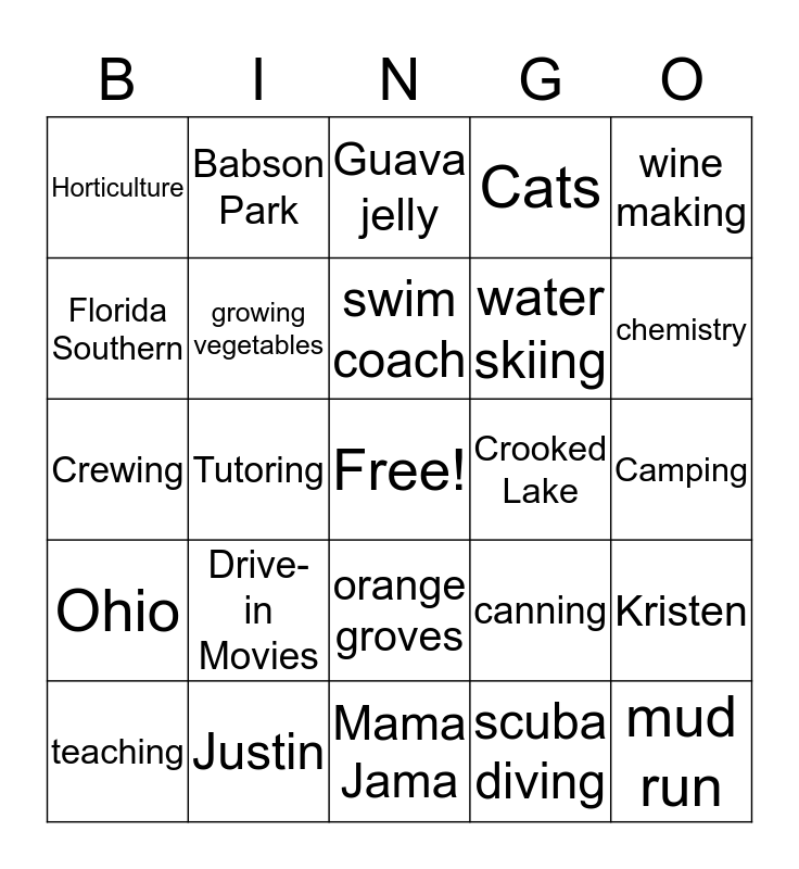 This bingo card has a free space and 24 words: Drive-in Movies, Justin, swim coach, teaching, wine making, Horticulture, Florida Southern, Babson Park, Crooked Lake, orange groves, water skiing, Crewing, canning, Kristen, growing vegetables, scuba diving, Camping, Guava jelly, chemistry, Tutoring, mud run, Ohio, Cats and Mama Jama.