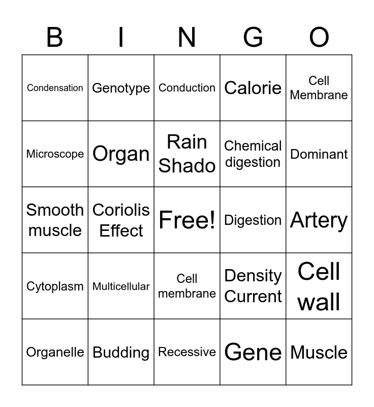 This bingo card has a free space and 70 words: Allele, Artery, Air Mass, Albedo, Budding, Cell, Calorie, Cell Theory, Cell Membrane, Cardiac, Cell wall, Climate, Condensation, Conduction, Convection, Coriolis Effect, Cell membrane, Chemical digestion, Chloroplast, Cytoplasm, Digestion, Density Current, Dominant, Esophagus, Evaporation, Excretory system, Exoskeleton, Front, Gene, Genetics, Genotype, Gravitropism, Homeostasis, Heterozygous, Homozygous, Joint, Kinetic, Latitude, Ligament, Microscope, Mechanical digestion, Multicellular, Muscle, Nervous system, Nucleus, Organ, Organelle, Peristalsis, Precipitation, Pollination, Phenotype, Phototropism, Photosynthesis, Protein, Recessive, Radiation, Rain Shado, Regeneration, Skeletal system, Specific Heat, Smooth muscle, Temperature, Transpiration, Tissue, Unicellular, Vein, Villi, Water Cycle, Weather and Wind.