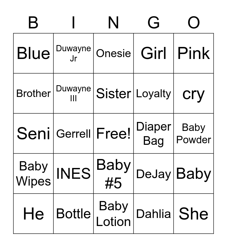 This bingo card has a free space and 24 words: INES, Bottle, Sister, He, Pink, Blue, Brother, Duwayne Jr, Diaper Bag, Baby #5, Loyalty, Seni, DeJay, Baby, Duwayne III, Dahlia, Baby Powder, Onesie, cry, Gerrell, She, Baby Wipes, Girl and Baby Lotion.