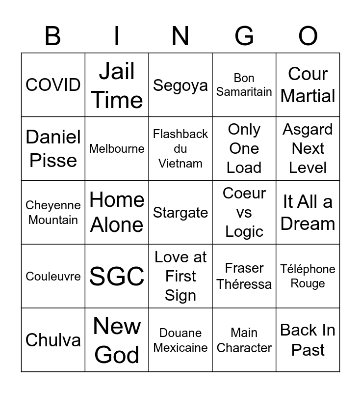This bingo card has a free space and 27 words: Fraser Théressa, Gate Keeper, Only One Load, Douane Mexicaine, Daniel Pisse, Segoya, Jail Time, Couleuvre, Coeur vs Logic, Téléphone Rouge, Cheyenne Mountain, Bon Samaritain, Chulva, New God, Asgard Next Level, Daniel Le Script, Melbourne, Flashback du Vietnam, SGC, COVID, It All a Dream, Main Character, Home Alone, Back In Past, Love at First Sign, Cour Martial and Haut Parleur.