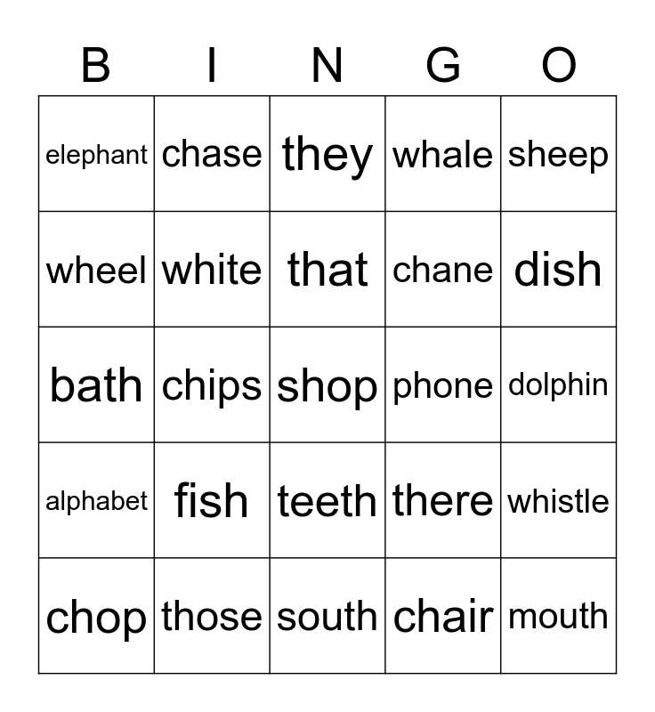 This bingo card has 25 words: fish, south, that, chop, sheep, elephant, wheel, chase, phone, teeth, chane, bath, there, whistle, white, mouth, dolphin, they, dish, chips, shop, those, alphabet, whale and chair.