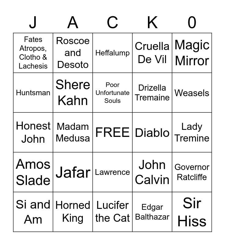 This bingo card has a free space and 81 words: Skar, Hyenas, Heffalump, Peg Leg Pete, Malificent, Evil Queen Grimhilde, Captain Hook, Mr. Smee, Queen of Hearts, Ursula, Gaston Le Gume, Dr. Facilier, Cruella De Vil, Fates Atropos, Clotho & Lachesis, Hades, Huntsman, Iago, Jafar, Kaa, Lady Tremine, Madam Mim, Magic Mirror, Honest John, Poor Unfortunate Souls, Shere Kahn, Jack Skellington, Stromboli, Monstro, Chernabog's Minions, The Hunter aka Man, Weasels, Headless Horseman, Lucifer the Cat, Card Soldiers, Si and Am, Diablo, Goons, Jasper and Horace, King Louie, Prince John, Sir Hiss, Sheriff of Nottingham, Woozles, Brutus and Nero, Madam Medusa, Professor Ratigan, Roscoe and Desoto, Flotsam and Jetsam, Le Fou, Banzai, Shensi, and Ed, John Calvin, Governor Ratcliffe, Claude Frollo, Pain and Panic, Shan Yu, Clayton, Yzma, Lyle Tiberius Rourke, Doris or Dor-15, Reggie, Darnell and Two Fingers, Lawrence, Friends on the Other Side, Dr. Facilier's Shadow, Captain Gantu, Mother Gothel, Turbo/King Candy, Prince Hans, Robert Callaghan, Bellwether, Kakamora, Dog Catcher, Amos Slade, Horned King, Oogie Boogie, Sid Phillips, Randall Bogs, Namaari, Edgar Balthazar, Anastasia Tremaine, Drizella Tremaine and Chernabog.