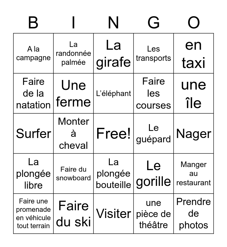 This bingo card has a free space and 56 words: Le safari, Faire une promenade en véhicule tout terrain, Faire de l'équitation, A la campagne, Visiter, Un château, Une ferme, Un vignoble, Faire les courses, Le marché, Les transports, en hélicoptère, en train, En avion, en autocar, en bâteau, en taxi, Monter à cheval, Voir des animaux, Prendre de photos, Le guépard, Le singe, Le gorille, La girafe, Le rhinocéros, L’éléphant, Le zèbre, Le lion, une île, La plage, L’océan, Une vague, La plongée sous-marine, Bronzer, Nager, Faire de la natation, Surfer, Faire du surf, La plongée libre, La randonnée palmée, La plongée bouteille, La montagne, Faire de l’escalade, Faire du VTT, Faire de la randonnée, Faire du snowboard, Faire du ski, Faire du Camping, La ville, Voir, une pièce de théâtre, Les bâtiments, Un concert, Un musée, Manger au restaurant and Faire du shopping.