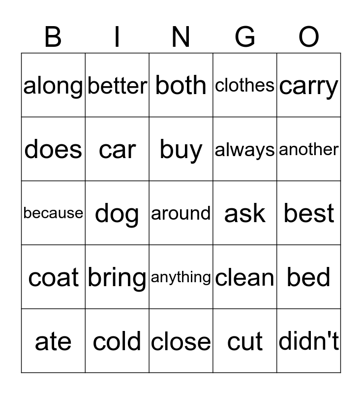 This bingo card has a free space and 24 words: bring, cold, buy, ate, carry, along, does, better, ask, anything, always, because, clean, bed, car, cut, best, both, another, dog, didn't, coat, clothes and close.