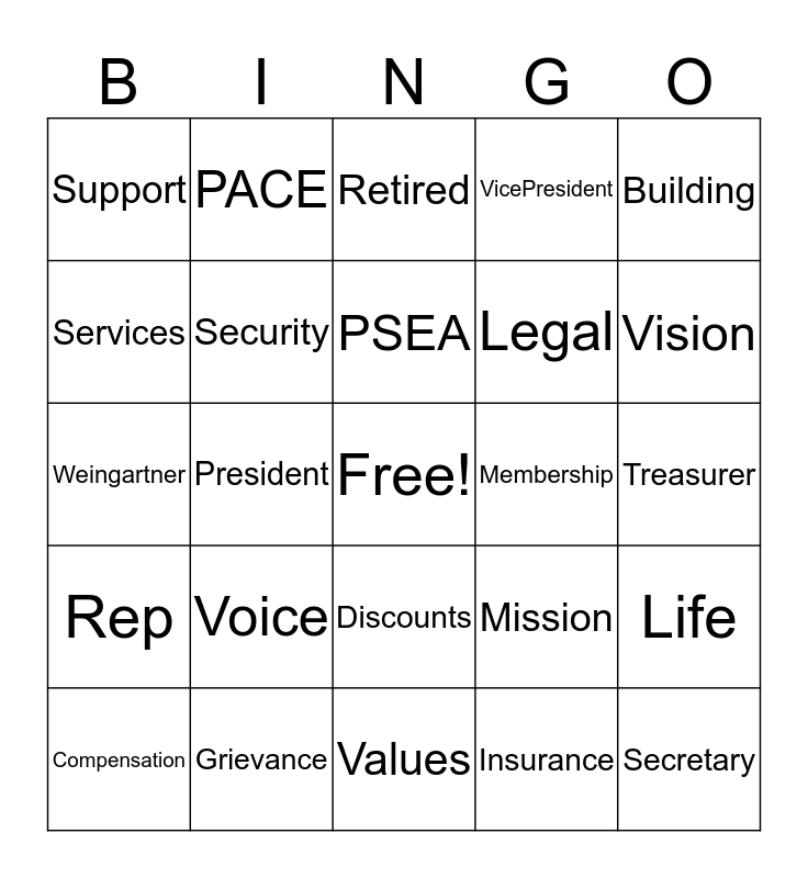 This bingo card has a free space and 40 words: Liability, Weingartner, Rights, Security, Grievance, Discounts, PSEA, Contract, Building, Rep, President, VicePresident, Secretary, Treasurer, Membership, Voice, Vote, Support, PSEA, Retired, Life, Insurance, Legal, Services, Loans, Events, Gettysburg, Meetings, Communications, Uniserve, NEA, Compensation, Education, Mission, Vision, Values, Partners, Friendship, PACE and CreditCard.