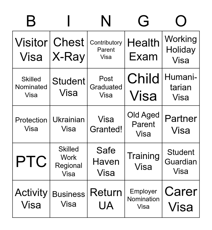 This bingo card has a free space and 29 words: Activity Visa, Global Talent Visa, Ukrainian Visa, Skilled Regional Visa, Visitor Visa, Contributory Parent Visa, Student Visa, Skilled Work Regional Visa, Old Aged Parent Visa, Business Visa, Partner Visa, Carer Visa, Return UA, Employer Nomination Visa, Humani-tarian Visa, Skilled Shortage Visa, Safe Haven Visa, PTC, Working Holiday Visa, Protection Visa, Training Visa, Global Humanita-rian Visa, Child Visa, Skilled Nominated Visa, Health Exam, Chest X-Ray, Student Guardian Visa, Post Graduated Visa and Medical Treatment Visa.
