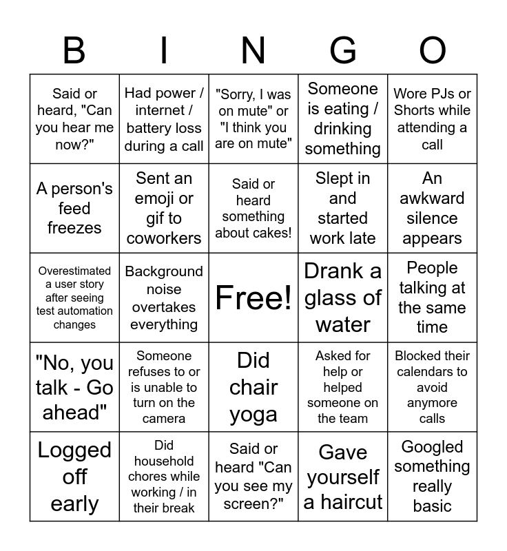 This bingo card has a free space and 24 words: Someone refuses to or is unable to turn on the camera, Did household chores while working / in their break, Said or heard something about cakes!, Logged off early, Wore PJs or Shorts while attending a call, Said or heard, "Can you hear me now?", A person's feed freezes, Had power / internet / battery loss during a call, Drank a glass of water, Did chair yoga, Slept in and started work late, Overestimated a user story after seeing test automation changes, Asked for help or helped someone on the team, Blocked their calendars to avoid anymore calls, Sent an emoji or gif to coworkers, Gave yourself a haircut, People talking at the same time, "Sorry, I was on mute" or "I think you are on mute", An awkward silence appears, Background noise overtakes everything, Googled something really basic, "No, you talk - Go ahead", Someone is eating / drinking something and Said or heard "Can you see my screen?".