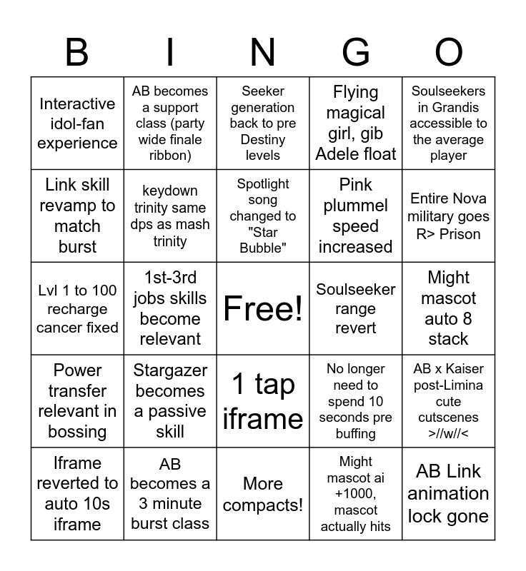This bingo card has a free space and 24 words: Stargazer becomes a passive skill, AB becomes a 3 minute burst class, Spotlight song changed to "Star Bubble", Iframe reverted to auto 10s iframe, Soulseekers in Grandis accessible to the average player, Interactive idol-fan experience, Link skill revamp to match burst, AB becomes a support class (party wide finale ribbon), Soulseeker range revert, 1 tap iframe, Pink plummel speed increased, Lvl 1 to 100 recharge cancer fixed, No longer need to spend 10 seconds pre buffing, AB x Kaiser post-Limina cute cutscenes >//w//<, keydown trinity same dps as mash trinity, Might mascot ai +1000, mascot actually hits, Might mascot auto 8 stack, Seeker generation back to pre Destiny levels, Entire Nova military goes R> Prison, 1st-3rd jobs skills become relevant, AB Link animation lock gone, Power transfer relevant in bossing, Flying magical girl, gib Adele float and More compacts!.