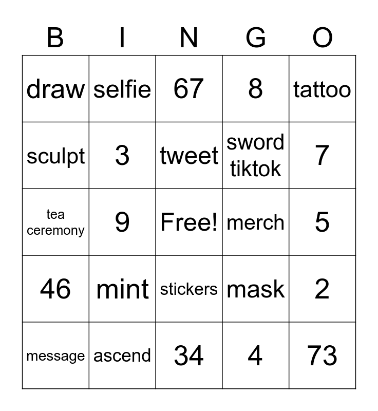 This bingo card has a free space and 24 words: mint, ascend, tweet, message, tattoo, draw, sculpt, selfie, merch, stickers, sword tiktok, tea ceremony, mask, 2, 3, 4, 5, 67, 7, 9, 73, 46, 8 and 34.