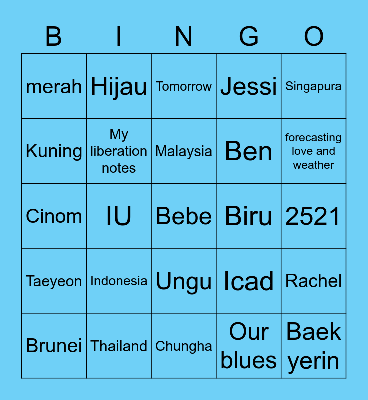 This bingo card has a free space and 24 words: Indonesia, Thailand, Malaysia, Brunei, Singapura, merah, Kuning, Hijau, Biru, Ungu, Ben, Cinom, Icad, Rachel, My liberation notes, Our blues, 2521, Tomorrow, forecasting love and weather, IU, Baek yerin, Taeyeon, Jessi and Chungha.