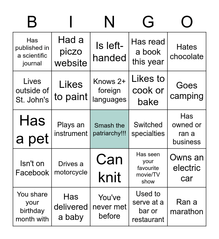 This bingo card has a free space and 24 words: Drives a motorcycle, Has delivered a baby, Knows 2+ foreign languages, You share your birthday month with, Hates chocolate, Has published in a scientific journal, Lives outside of St. John's, Had a piczo website, Switched specialties, Can knit, Likes to cook or bake, Has a pet, Has seen your favourite movie/TV show, Owns an electric car, Likes to paint, Used to serve at a bar or restaurant, Has owned or ran a business, Is left-handed, Goes camping, Plays an instrument, Ran a marathon, Isn't on Facebook, Has read a book this year and You've never met before.