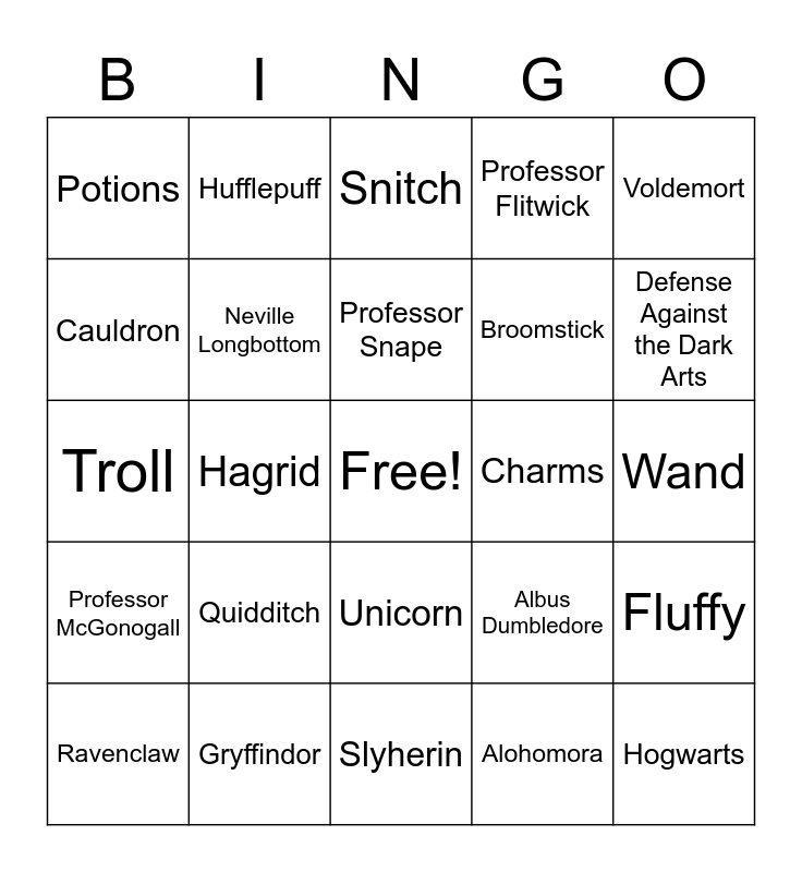 This bingo card has a free space and 36 words: Harry Potter, Ron Weasley, Hermione Granger, Neville Longbottom, Albus Dumbledore, Professor McGonogall, Professor Snape, Professor Quirrell, Voldemort, Fred and George Weasley, Hagrid, Professor Flitwick, Muggle, Charms, Defense Against the Dark Arts, Potions, Herbology, Quidditch, Hogwarts, Snitch, Wand, Fluffy, Gryffindor, Ravenclaw, Slyherin, Hufflepuff, Troll, Hedwig, Broomstick, Cauldron, Petrificus Totalus, Wingardium Leviosa, Alohomora, Unicorn, Scar and Lightning Bolt.