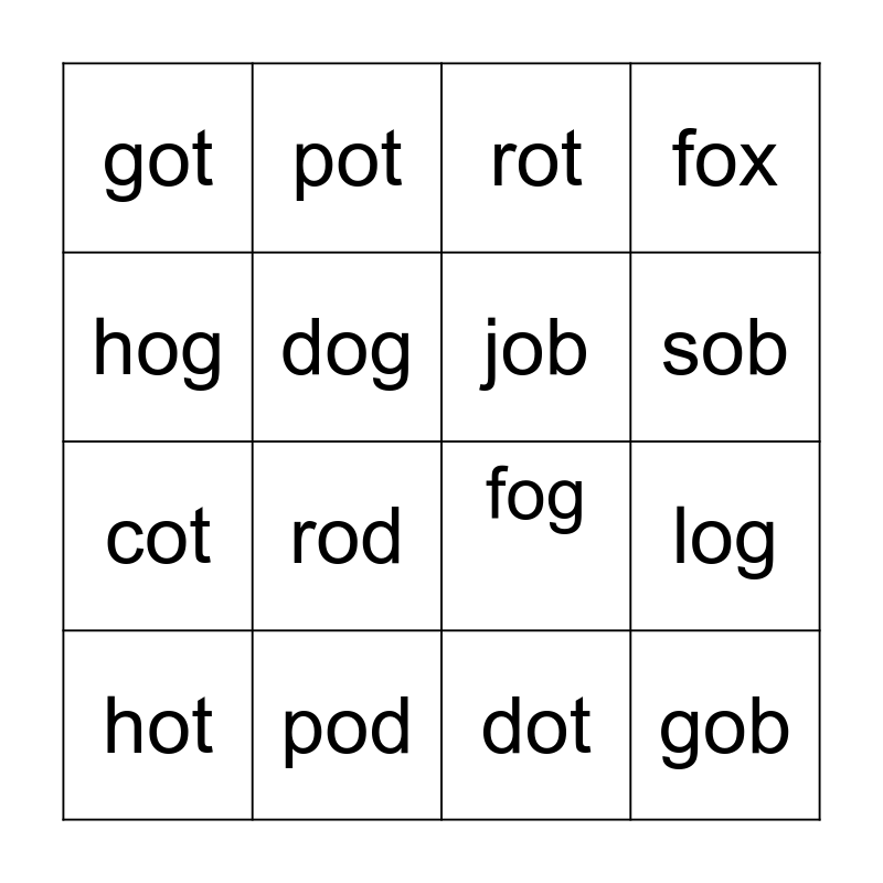 This bingo card has 20 words: log, cob, rot, sob, hot, hog, pod, got, cot, pot, rod, fog, dog, gob, job, mop, sob, fox, dot and hop.