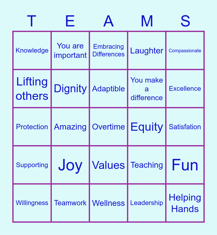 This bingo card has 30 words: Teamwork, Appreciation, Amazing, Individual, Knowledge, Embracing Differences, Dignity, Values, Equity, Wellness, Satisfation, Overtime, Leadership, Helping Hands, Excellence, Learning, Teaching, Supporting, Joy, Compassionate, Protection, Smart, You are important, You make a difference, Lifting others, Laughter, Fun, Willingness, Adaptible and Visionary.