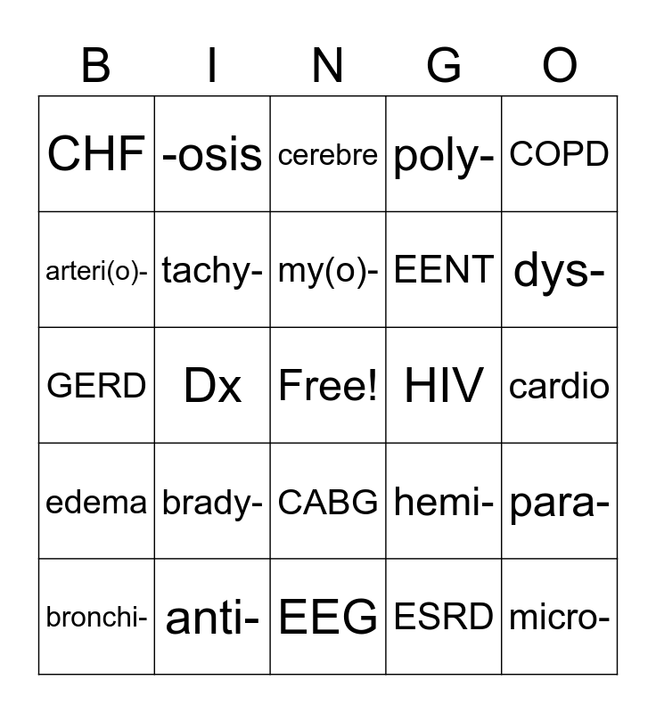 This bingo card has a free space and 24 words: brady-, anti-, my(o)-, bronchi-, COPD, CHF, arteri(o)-, -osis, HIV, CABG, EENT, GERD, hemi-, para-, tachy-, ESRD, cardio, cerebre, dys-, Dx, micro-, edema, poly- and EEG.