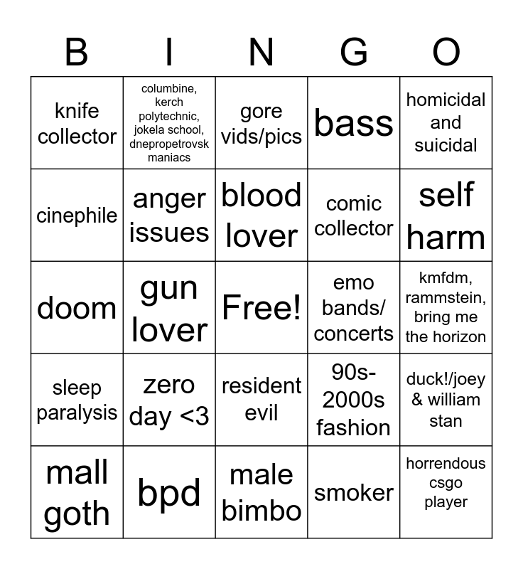 This bingo card has a free space and 24 words: zero day <3, bpd, blood lover, mall goth, homicidal and suicidal, knife collector, cinephile, columbine, kerch polytechnic, jokela school, dnepropetrovsk maniacs, emo bands/ concerts, resident evil, comic collector, doom, 90s-2000s fashion, duck!/joey & william stan, anger issues, smoker, kmfdm, rammstein, bring me the horizon, gore vids/pics, self harm, gun lover, horrendous csgo player, sleep paralysis, bass and male bimbo.