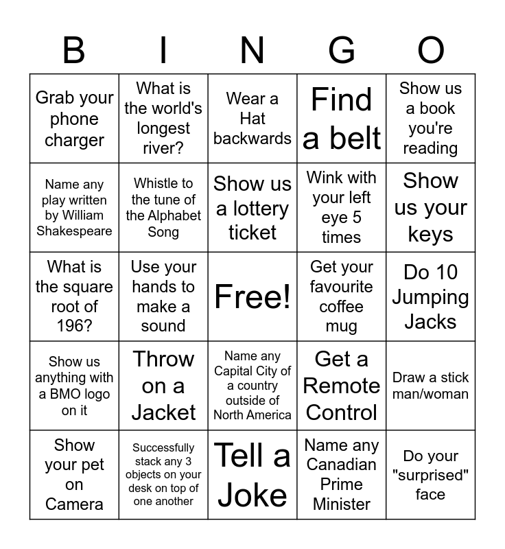 This bingo card has a free space and 29 words: Show your pet on Camera, Find a Pen, Use your hands to make a sound, Put on a Green article of clothing, Grab your phone charger, Wear a Hat backwards, Whistle to the tune of the Alphabet Song, Throw on a Jacket, Get your favourite coffee mug, Successfully stack any 3 objects on your desk on top of one another, Do 10 Jumping Jacks, Do your "surprised" face, Tell a Joke, Name any Canadian Prime Minister, Show us your keys, Pull out a $20 bill, Name any Capital City of a country outside of North America, Show us anything with a BMO logo on it, Show us a book you're reading, What is the square root of 196?, Get a Remote Control, Find any piece of sports equipment, Wink with your left eye 5 times, Name any play written by William Shakespeare, Find a belt, What is the world's longest river?, Draw a stick man/woman, Show us a lottery ticket and Wear a piece of jewellery.