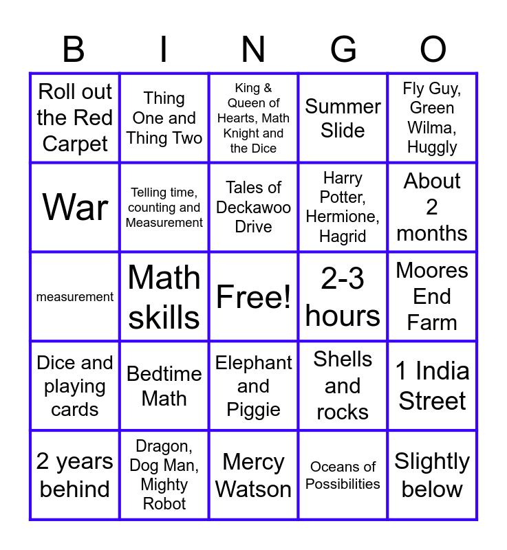 This bingo card has a free space and 31 words: Mercy Watson, Nantucket Atheneum, Math skills, cereal, legos, pennies, Roll out the Red Carpet, King & Queen of Hearts, Math Knight and the Dice, Telling time, counting and Measurement, Shells and rocks, 2-3 hours, Oceans of Possibilities, Moores End Farm, Slightly below, Closed captioning, Elsa, About 2 months, sidewalk chalk, 1 India Street, Bedtime Math, Dice and playing cards, Elephant and Piggie, Fly Guy, Green Wilma, Huggly, Madaket Road, 2 years behind, Thing One and Thing Two, Harry Potter, Hermione, Hagrid, War, Summer Slide, measurement, Dragon, Dog Man, Mighty Robot, Tales of Deckawoo Drive and Book Mobile.