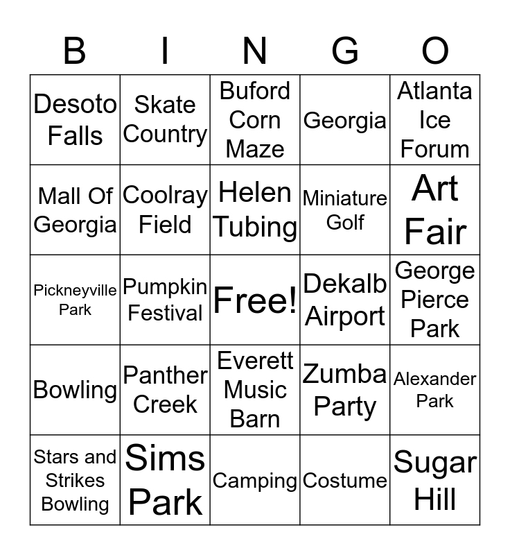 This bingo card has a free space and 24 words: Panther Creek, Sims Park, Helen Tubing, Stars and Strikes Bowling, Atlanta Ice Forum, Desoto Falls, Mall Of Georgia, Skate Country, Dekalb Airport, Everett Music Barn, Miniature Golf, Pickneyville Park, Zumba Party, Alexander Park, Coolray Field, Costume, George Pierce Park, Buford Corn Maze, Art Fair, Pumpkin Festival, Sugar Hill, Bowling, Georgia and Camping.
