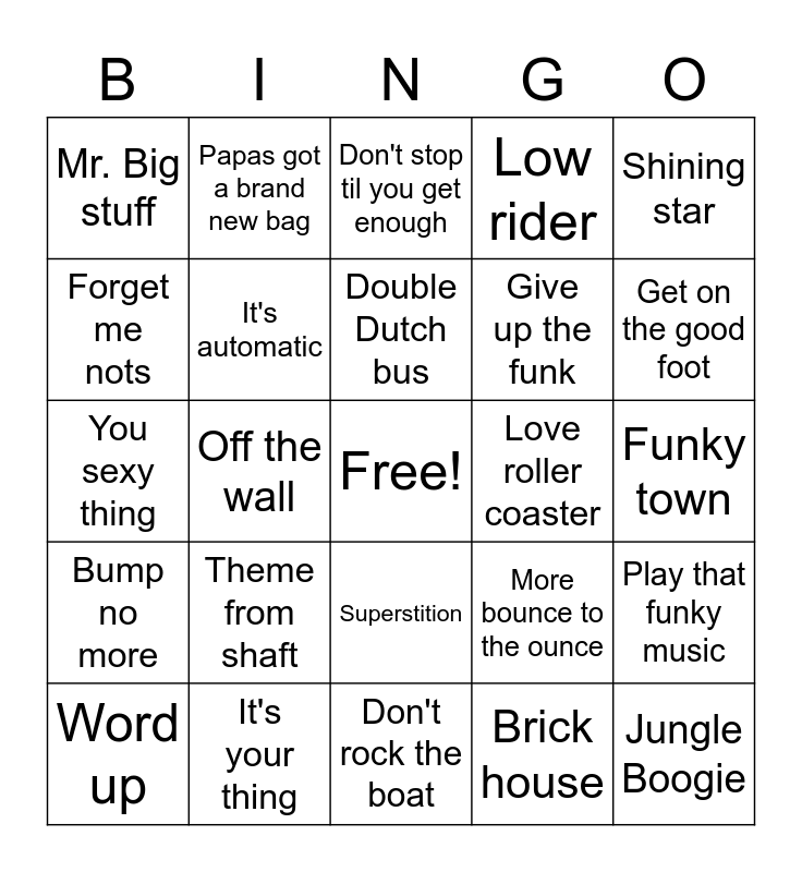 This bingo card has a free space and 45 words: Ain't nobody, Jungle Boogie, Get down on it, Word up, Super Freak, Brick house, Don't stop til you get enough, She's a bad mama jama, Shining star, It's your thing, Low rider, Love roller coaster, Superstition, Theme from shaft, Jungle love, Don't rock the boat, Don't stop the music, You sexy thing, No parking, Get on the good foot, Papas got a brand new bag, You dropped the bomb on me, Let's groove, Mr. Big stuff, Kung fu fighting, Funky town, Kiss, Rock steady, More bounce to the ounce, Bump no more, Dance to the music, Play that funky music, Let it whip, Tell me something good, I'll take you there, Off the wall, PYT, when doves cry, Car wash, Double Dutch bus, Forget me nots, Give up the funk, Freakazoid, It's automatic and September.