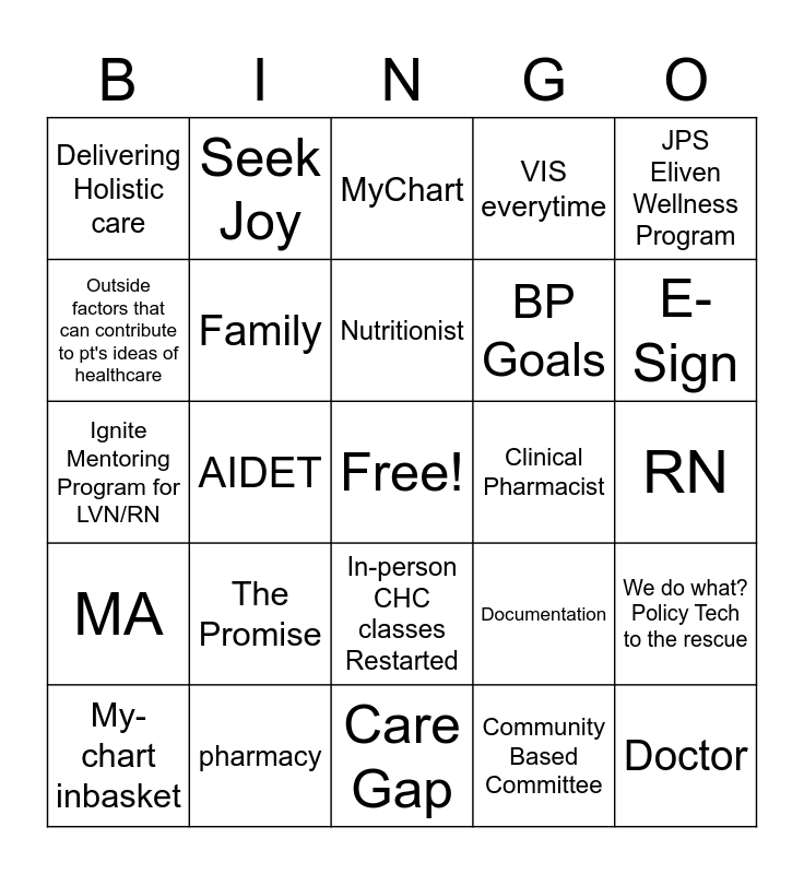 This bingo card has a free space and 24 words: The Promise, pharmacy, Nutritionist, My-chart inbasket, JPS Eliven Wellness Program, Delivering Holistic care, Outside factors that can contribute to pt's ideas of healthcare, Seek Joy, Clinical Pharmacist, In-person CHC classes Restarted, BP Goals, Ignite Mentoring Program for LVN/RN, Documentation, We do what? Policy Tech to the rescue, Family, Community Based Committee, RN, MyChart, E-Sign, AIDET, Doctor, MA, VIS everytime and Care Gap.