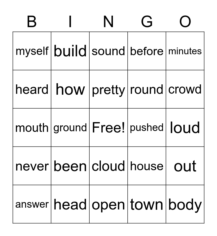 This bingo card has a free space and 24 words: been, head, pretty, answer, minutes, myself, heard, build, pushed, cloud, round, mouth, house, out, how, town, loud, sound, crowd, ground, body, never, before and open.