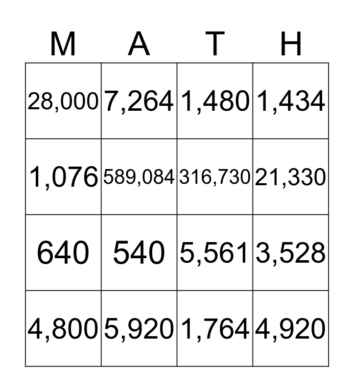 This bingo card has a free space and 15 words: 4,800, 4,920, 1,480, 28,000, 21,330, 1,076, 540, 1,764, 589,084, 640, 3,528, 1,434, 316,730, 7,264 and 5,920.