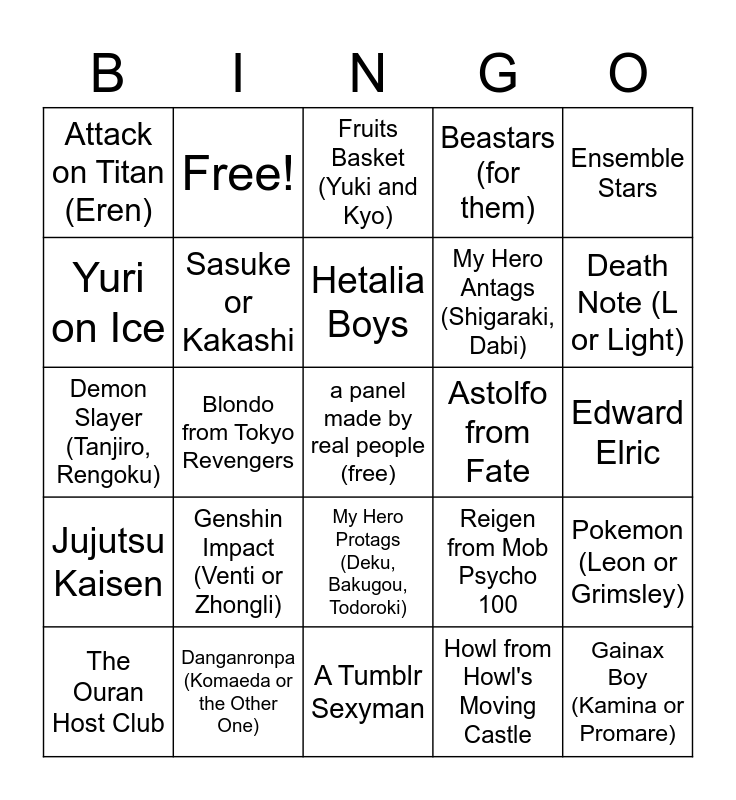 This bingo card has a free space and 24 words: Genshin Impact (Venti or Zhongli), Danganronpa (Komaeda or the Other One), Hetalia Boys, The Ouran Host Club, Ensemble Stars, Attack on Titan (Eren), Yuri on Ice, Free!, Astolfo from Fate, My Hero Protags (Deku, Bakugou, Todoroki), My Hero Antags (Shigaraki, Dabi), Demon Slayer (Tanjiro, Rengoku), Reigen from Mob Psycho 100, Pokemon (Leon or Grimsley), Sasuke or Kakashi, Howl from Howl's Moving Castle, Edward Elric, Fruits Basket (Yuki and Kyo), Death Note (L or Light), Blondo from Tokyo Revengers, Gainax Boy (Kamina or Promare), Jujutsu Kaisen, Beastars (for them) and A Tumblr Sexyman.