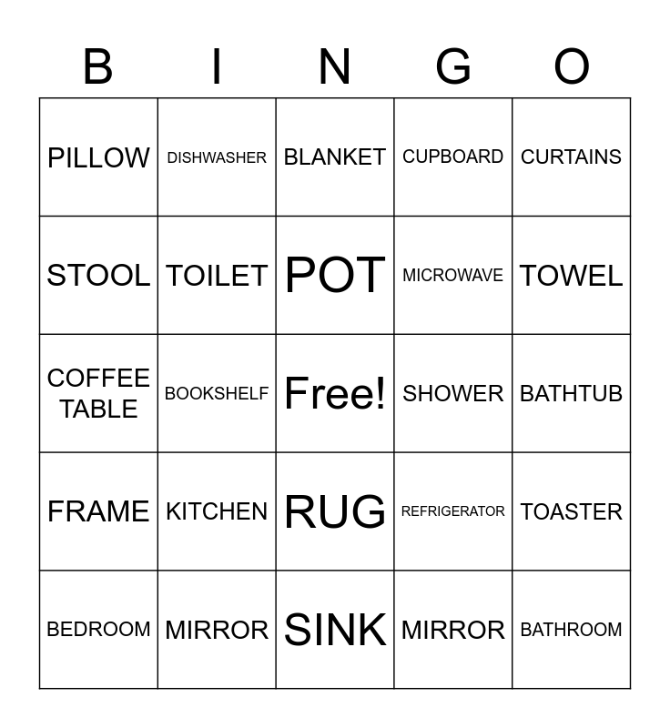 This bingo card has a free space and 29 words: BEDROOM, DRESSER, BOOKSHELF, POSTER, PILLOW, BLANKET, TOILET, KITCHEN, SHOWER, MIRROR, BATHTUB, BATHROOM, SINK, MIRROR, TOWEL, COUCH, RUG, FRAME, CURTAINS, COFFEE TABLE, REFRIGERATOR, STOVE, MICROWAVE, STOOL, CUPBOARD, DISHWASHER, TOASTER, POT and LIVING ROOM.