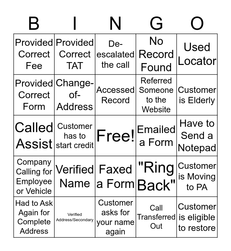 This bingo card has a free space and 24 words: Verified Name, Verified Address/Secondary, Accessed Record, Had to Ask Again for Complete Address, Used Locator, Provided Correct Fee, Provided Correct Form, Provided Correct TAT, Emailed a Form, Faxed a Form, Referred Someone to the Website, Called Assist, "Ring Back", Customer is Moving to PA, Change-of-Address, Call Transferred Out, Have to Send a Notepad, De-escalated the call, Customer is Elderly, Customer has to start credit, Customer is eligible to restore, Company Calling for Employee or Vehicle, No Record Found and Customer asks for your name again.