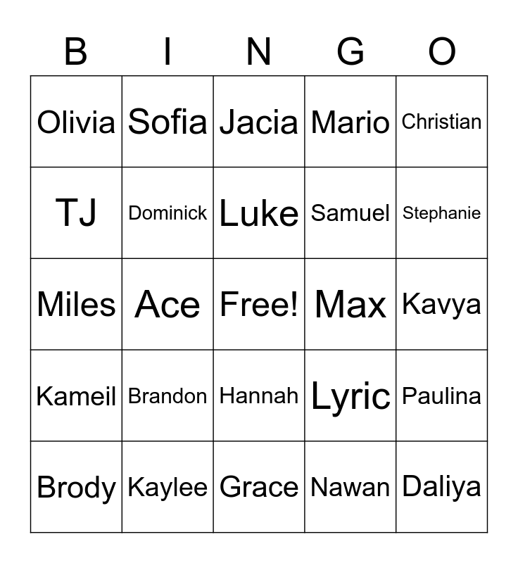 This bingo card has a free space and 24 words: Brandon, Kaylee, Luke, Brody, Christian, Olivia, TJ, Sofia, Max, Hannah, Samuel, Miles, Lyric, Paulina, Dominick, Nawan, Kavya, Jacia, Stephanie, Ace, Daliya, Kameil, Mario and Grace.