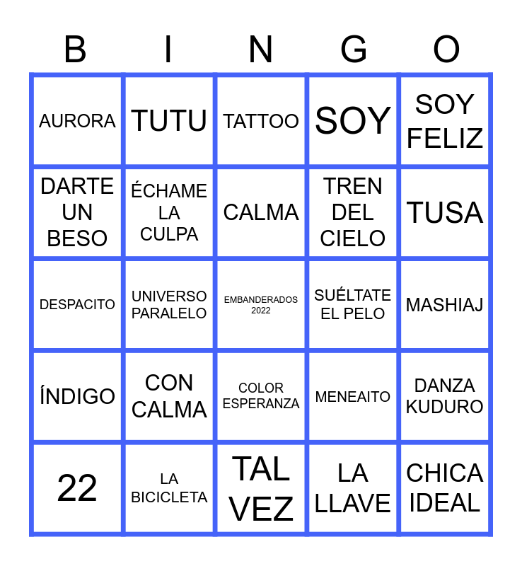 This bingo card has a free space and 24 words: CON CALMA, LA BICICLETA, CALMA, 22, SOY FELIZ, AURORA, DARTE UN BESO, TUTU, SUÉLTATE EL PELO, COLOR ESPERANZA, TREN DEL CIELO, DESPACITO, MENEAITO, DANZA KUDURO, ÉCHAME LA CULPA, LA LLAVE, MASHIAJ, TATTOO, TUSA, UNIVERSO PARALELO, CHICA IDEAL, ÍNDIGO, SOY and TAL VEZ.
