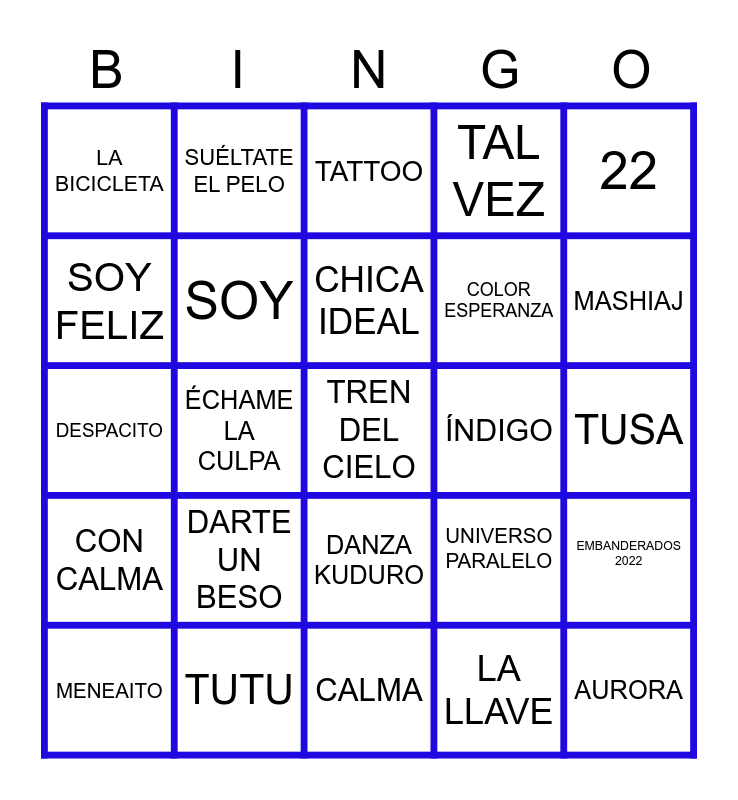 This bingo card has a free space and 24 words: DARTE UN BESO, TUTU, CHICA IDEAL, MENEAITO, 22, LA BICICLETA, SOY FELIZ, SUÉLTATE EL PELO, ÍNDIGO, DANZA KUDURO, COLOR ESPERANZA, DESPACITO, UNIVERSO PARALELO, EMBANDERADOS 2022, SOY, LA LLAVE, TUSA, TATTOO, MASHIAJ, ÉCHAME LA CULPA, AURORA, CON CALMA, TAL VEZ and CALMA.