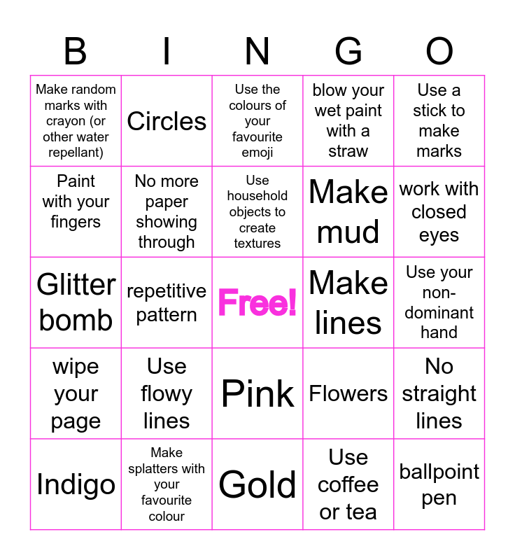 This bingo card has a free space and 24 words: Use flowy lines, Make splatters with your favourite colour, Use household objects to create textures, Indigo, Use a stick to make marks, Make random marks with crayon (or other water repellant), Paint with your fingers, Circles, Make lines, Pink, Make mud, Glitter bomb, Flowers, No straight lines, No more paper showing through, Use coffee or tea, Use your non-dominant hand, Use the colours of your favourite emoji, work with closed eyes, repetitive pattern, ballpoint pen, wipe your page, blow your wet paint with a straw and Gold.