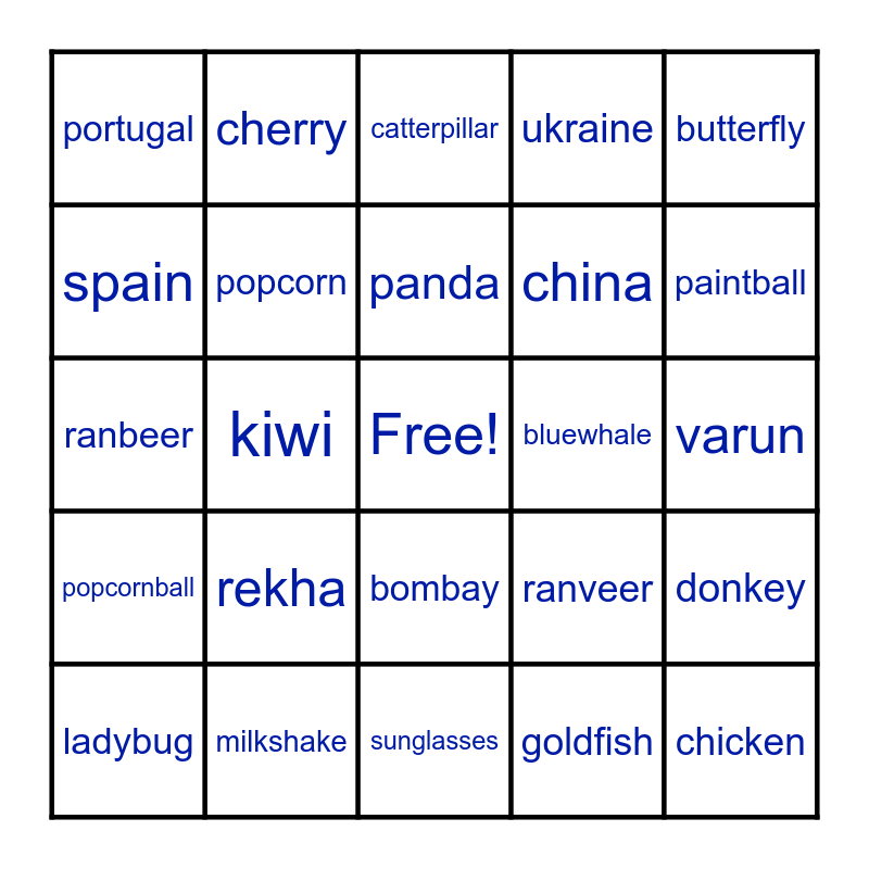 This bingo card has a free space and 61 words: pancake, milkshake, frenchfries, popcornball, goldfish, lemon_water, popcorn, Japan, china, belgium, ukraine, iceland, spain, germany, thailand, portugal, chicken, butterfly, starfish, panda, bluewhale, catterpillar, ladybug, donkey, table_tennis, boxing, basketball, golf, paintball, football, hockey, cricket, orange, pineapple, cherry, strawberry, custardapple, kiwi, mango, ranbeer, ajaydevgan, rekha, varun, salman, ranveer, haridwar, sholapur, rajkot, kanyakumar, bombay, sunglasses, iPhone, Facebook, sunny, watchdog, pokemon, handball, earthworm, shershah, panipat and housefull 4.