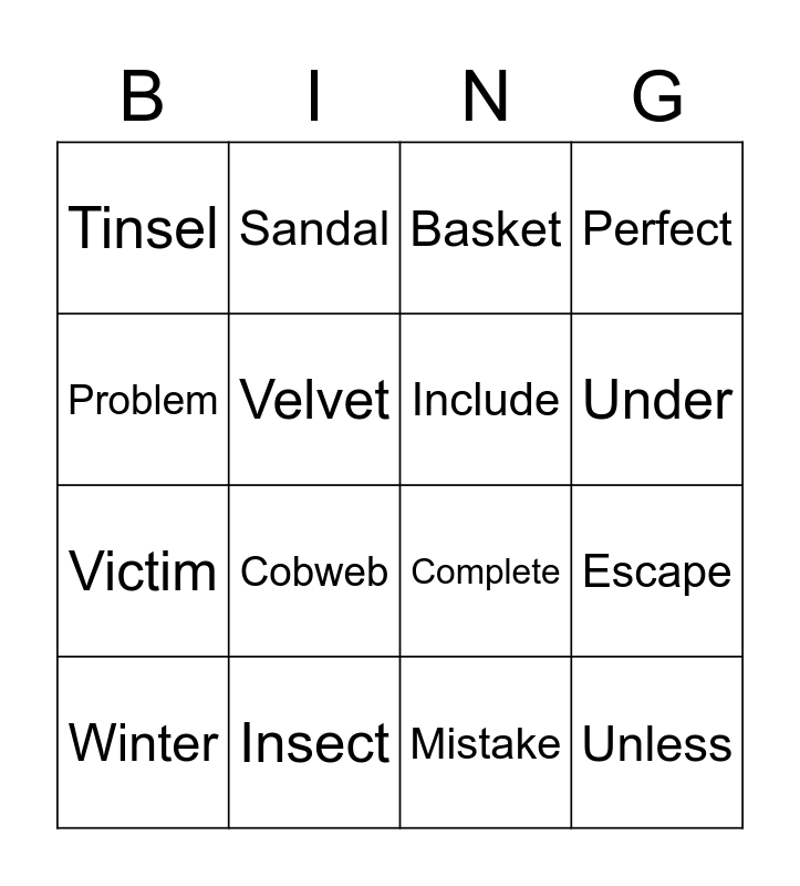 This bingo card has 20 words: Escape, Napkin, Basket, Picnic, Winter, Problem, Insect, Tinsel, Victim, Sandal, Cobweb, Complete, Velvet, Unless, Include, Sister, Under, Perfect, Mistake and Member.