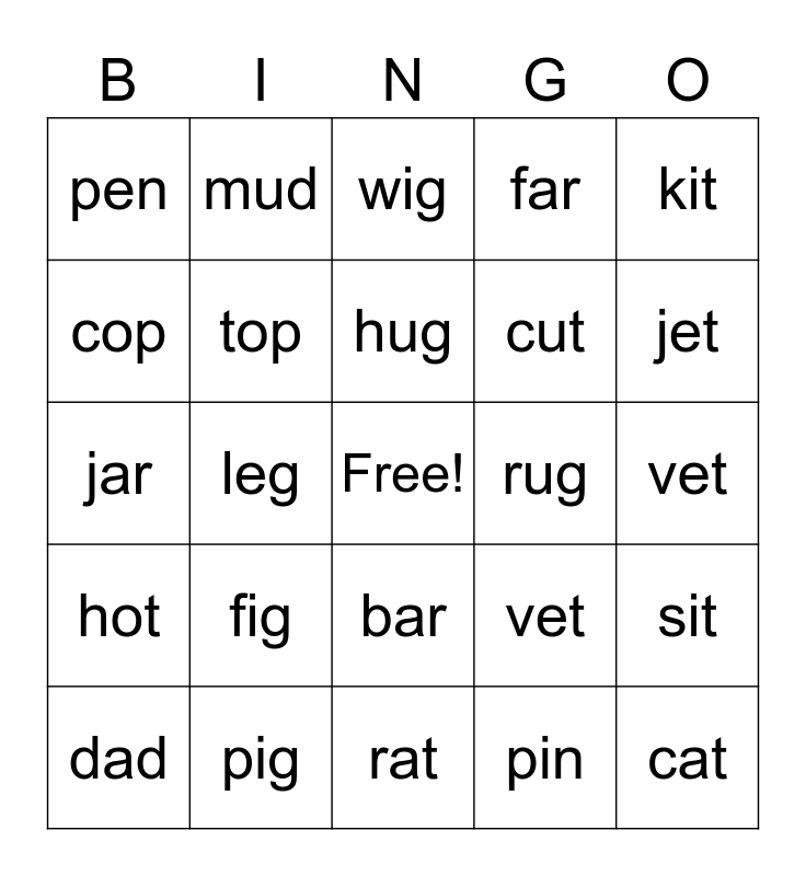 This bingo card has a free space and 52 words: cat bat rat fig mug mud den cop pin top ten sit vet bug rug hug rug bin kit leg pin pen cut pad gut hut pet jet net big far sun hay bay wig pig mat pot sad mad vet hot car bar dot wet jar tag hat dad mat, cat, bat, rat, fig, mug, mud, den, cop, pin, top, ten, sit, vet, bug, rug, hug, rug, bin, kit, leg, pin, pen, cut, pad, gut, hut, pet, jet, net, big, far, sun, hay, bay, wig, pig, mat, pot, sad, mad, vet, hot, car, bar, dot, wet, jar, tag, hat, dad and mat.