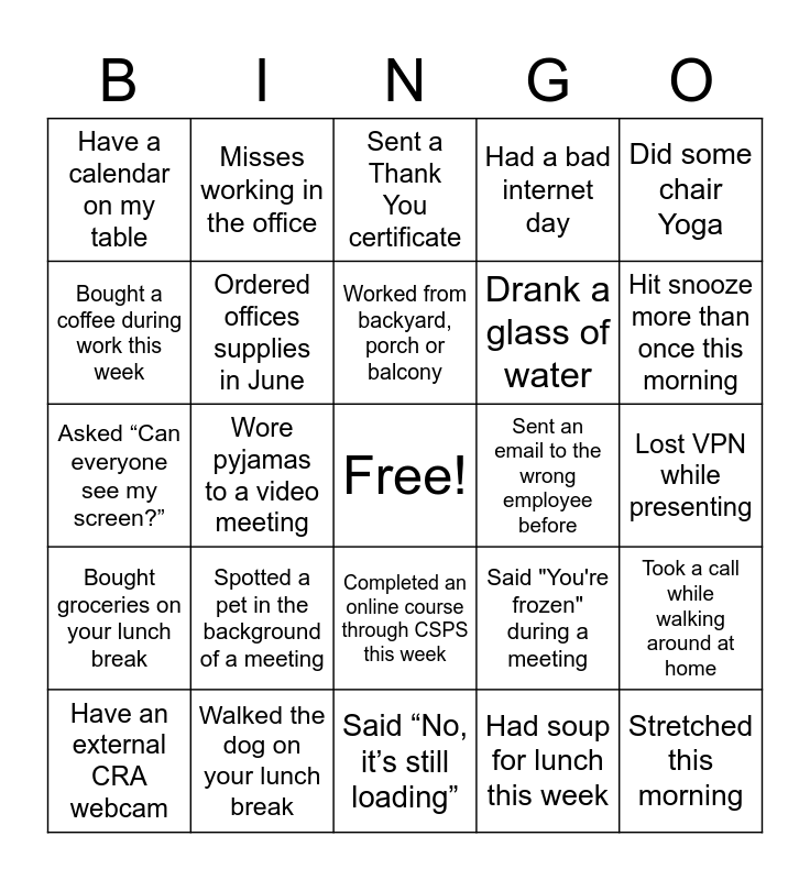 This bingo card has a free space and 82 words: Participated in last year’s CRA Charitable Campaign, Loves National Public Service Week, Sent a Thank You certificate, Updated my Mobility Bank Profile, Nominated someone for an Award of Excellence, “My VPN isn’t working”, “Your camera is frozen!”, Called IT once this week, VPN crashed once in the last two weeks, Forgot my LAN password on Monday, Outlook crashed once this week, Had a scheduled re-entry this week, Ordered offices supplies in June, Sent an email to the wrong employee before, Have your meeting interrupted by a pet, Have a calendar on my table, Have an external CRA webcam, Bought a coffee during work this week, Laptop restarted for updates this week, Made an uber eats order during work this month, Got a message saying your outlook is getting full, Drank a glass of water, Stretched this morning, Did some chair Yoga, Wore pyjamas to a video meeting, Talked out loud to yourself, Replied with “lol: and actually laughed, Meditated this morning, Joked about how long commute was, Listened to music while working, Spotted a pet in the background of a meeting, Answered a chat today, Asked “Can everyone see my screen?”, Said “Sorry – I was on mute”, Said “Can you hear me?”, Said “No, it’s still loading”, Said “Next slide please”, Said “Sorry, I’m having connection issues”, Hit snooze more than once this morning, Did household chores on your lunch break, A bird flew into my window, Had a bad internet day, Used an emoji in an email, Forgot to stop screen sharing, Customized background on a video call, Misses working in the office, Actually saw a co-worker in person, Worked from backyard, porch or balcony, Drank a coffee on a teams call, Only heard every 5th word but got the gist, Worked with a pet on your lap, Lost VPN while presenting, Walked the dog on your lunch break, Phone ran out of battery during a call, Forgot the attachment while sending an email, Did eye strain relief exercises, Completed everything on your work to-do list yesterday, Had a cup of tea during a call/meeting, Currently working from the sofa, Said "You're frozen" during a meeting, Did the dishes on your break, Worked with the window open, Bought groceries on your lunch break, Made a smoothie/protein shake as a work snack, Shared your sound during a Teams meeting, Logged into ISS/Candidate Profile, Met a colleague for a virtual "coffee break/lunch", Used the IT online chat feature, Checked voicemail on your work cell yesterday, Have a post it note(s) on your laptop/desktop screen, Wore shorts during work once this week, Took written notes down during a meeting, Completed an online course through CSPS this week, Had soup for lunch this week, Went for a walk after work once this week, Have a fan on your desk, Currently wearing slippers at your work station, Has dark mode on for MS Teams, Knows how to play a musical instrument, Have a work from home playlist, Took a call while walking around at home and Shopped online for yourself this week.