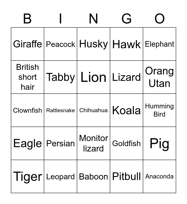 This bingo card has a free space and 24 words: Persian, Leopard, Lion, Tiger, Elephant, Giraffe, British short hair, Peacock, Koala, Monitor lizard, Lizard, Clownfish, Goldfish, Pig, Tabby, Pitbull, Humming Bird, Husky, Orang Utan, Rattlesnake, Anaconda, Eagle, Hawk and Baboon.