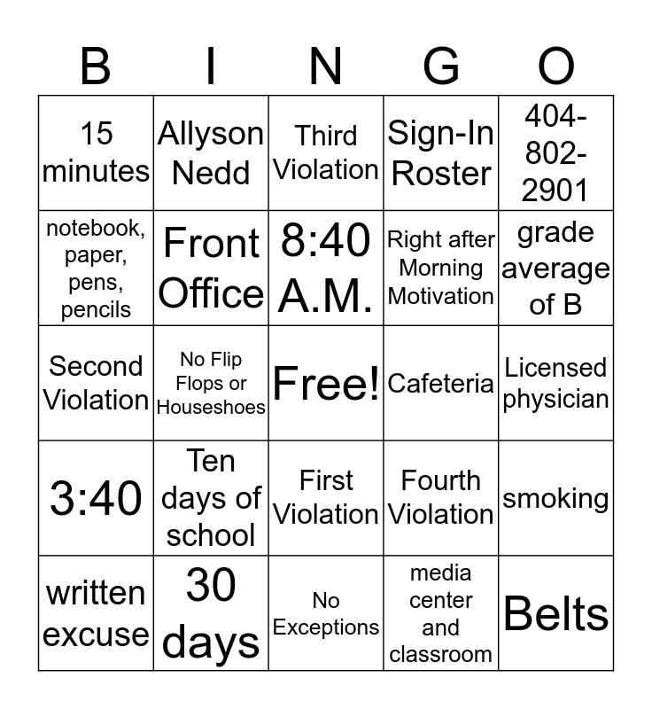 This bingo card has a free space and 24 words: Ten days of school, 30 days, 8:40 A.M., written excuse, 404-802-2901, 15 minutes, notebook, paper, pens, pencils, Allyson Nedd, Cafeteria, First Violation, Right after Morning Motivation, Second Violation, Fourth Violation, smoking, Front Office, media center and classroom, Licensed physician, Third Violation, grade average of B, No Flip Flops or Houseshoes, Belts, 3:40, Sign-In Roster and No Exceptions.