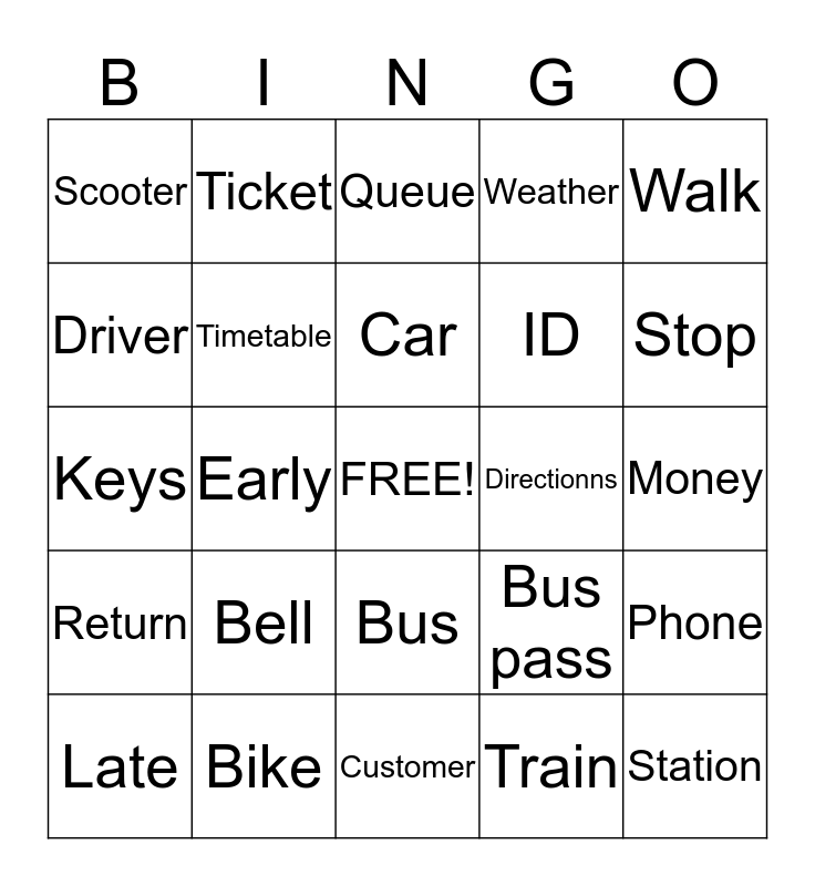 This bingo card has a free space and 26 words: Bus, Train, Car, Bike, Walk, Scooter, Driver, Ticket, Money, Bus pass, ID, Keys, Phone, Late, Early, Cancelled, Weather, Return, Queue, Station, Stop, Customer, Directionns, Bell, Timetable and Organised.