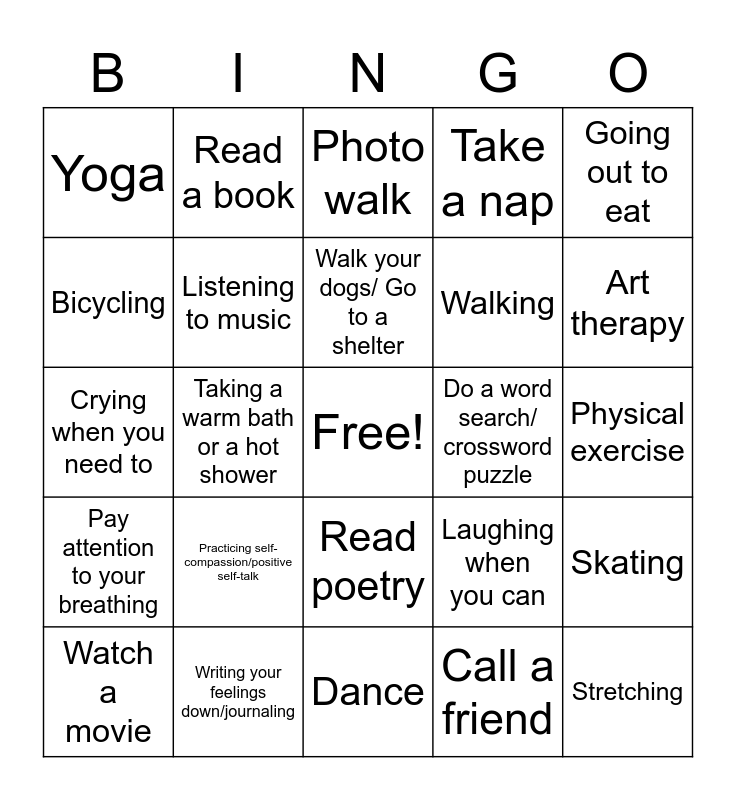 This bingo card has a free space and 33 words: Breath of fresh air, Snuggling a cozy blanket, Taking a warm bath or a hot shower, Cuddling with a pet, Pay attention to your breathing, Listening to music, Going out to eat, Watch a movie, Read a book, Be a tourist, Walk your dogs/ Go to a shelter, Photo walk, Try a new activity, Clean out a junk drawer, Do a word search/ crossword puzzle, Art therapy, Writing your feelings down/journaling, Crying when you need to, Practicing self-compassion/positive self-talk, Laughing when you can, Read poetry, Practice gratitude, Yoga, Physical exercise, Dance, Stretching, Take a nap, Walking, Bicycling, Skating, Lunch date, Call a friend and Join a support group.