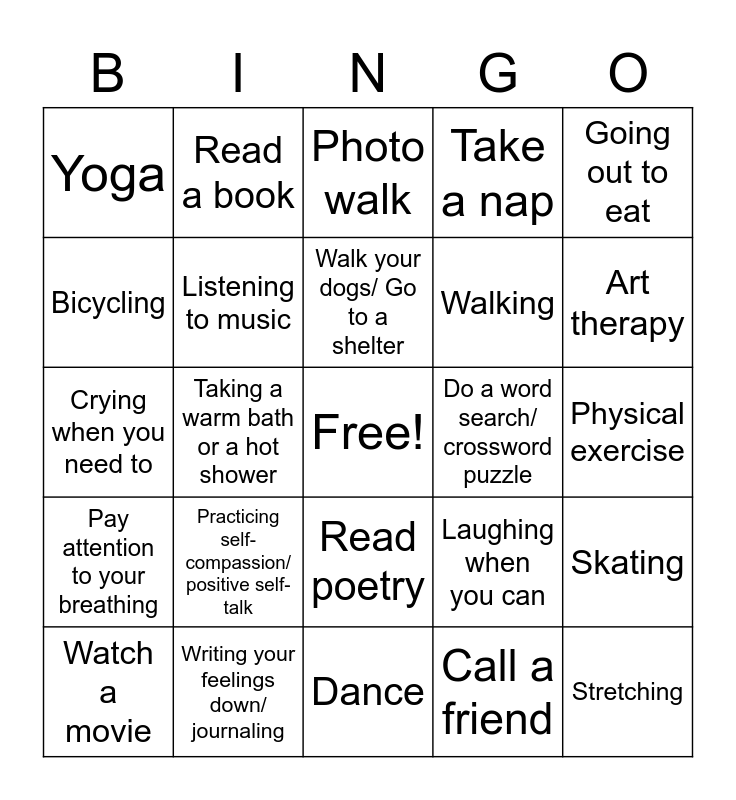 This bingo card has a free space and 33 words: Breath of fresh air, Snuggling a cozy blanket, Taking a warm bath or a hot shower, Cuddling with a pet, Pay attention to your breathing, Listening to music, Going out to eat, Watch a movie, Read a book, Be a tourist, Walk your dogs/ Go to a shelter, Photo walk, Try a new activity, Clean out a junk drawer, Do a word search/ crossword puzzle, Art therapy, Writing your feelings down/ journaling, Crying when you need to, Practicing self-compassion/ positive self-talk, Laughing when you can, Read poetry, Practice gratitude, Yoga, Physical exercise, Dance, Stretching, Take a nap, Walking, Bicycling, Skating, Lunch date, Call a friend and Join a support group.