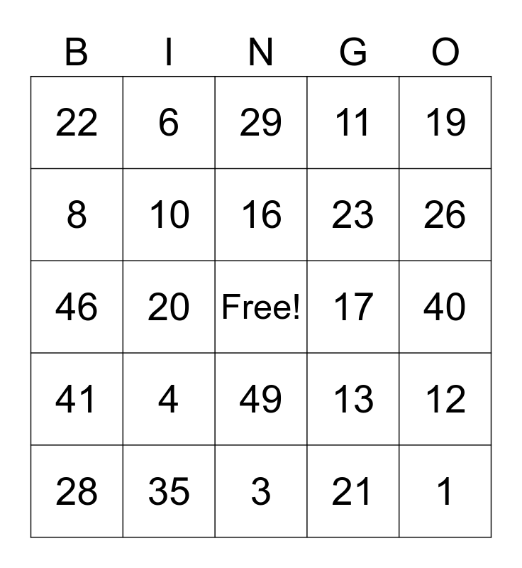 This bingo card has a free space and 51 words: 0, 1, 2, 3, 4, 5, 6, 7, 8, 9, 10, 11, 12, 13, 14, 15, 16, 17, 18, 19, 20, 21, 22, 23, 24, 25, 26, 27, 28, 29, 30, 31, 32, 33, 34, 35, 36, 37, 38, 39, 40, 41, 42, 43, 44, 45, 46, 47, 48, 49 and 50.