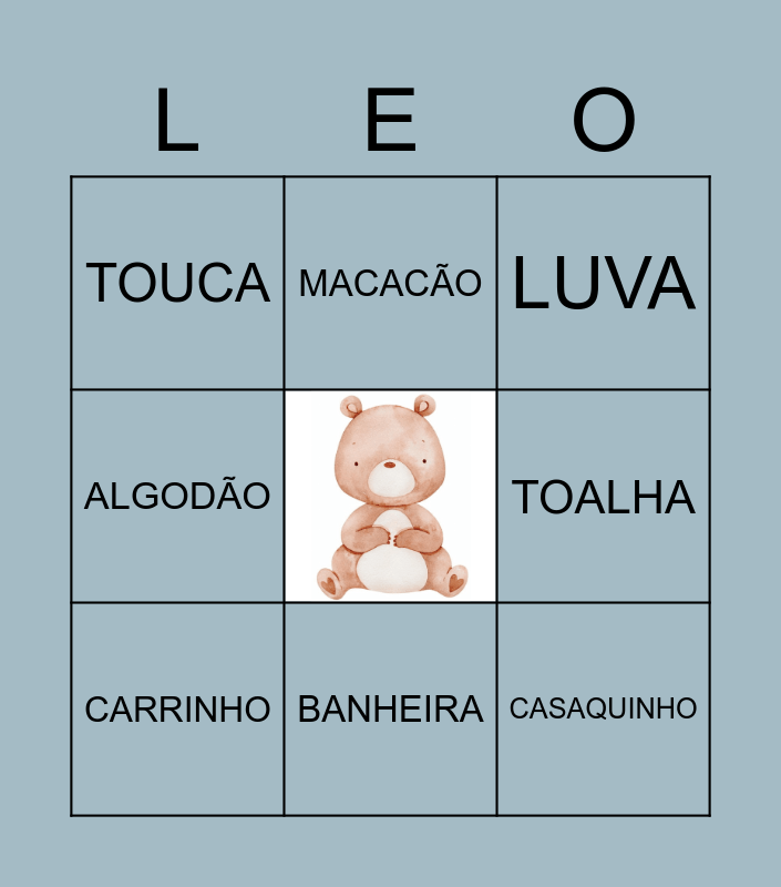 This bingo card has a free space and 21 words: CANÇÃO DE NINAR, MEIA, MACACÃO, SABONETE, FRALDA, CARRINHO, TOUCA, LUVA, BERÇO, BANHEIRA, COTONETE, ALGODÃO, MANTA, PAPINHA, TOALHA, MAMADEIRA, POLTRONA, TROCADOR, CASAQUINHO, BODY and CHOCALHO.