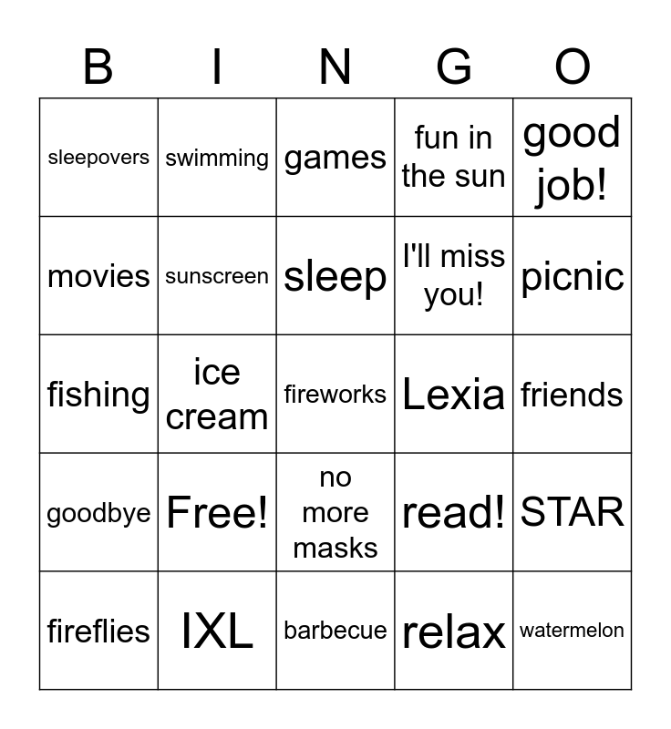 This bingo card has 25 words: Free!, barbecue, sleep, fireflies, good job!, sleepovers, movies, swimming, Lexia, no more masks, I'll miss you!, fishing, read!, STAR, sunscreen, watermelon, friends, games, picnic, ice cream, fireworks, IXL, goodbye, fun in the sun and relax.