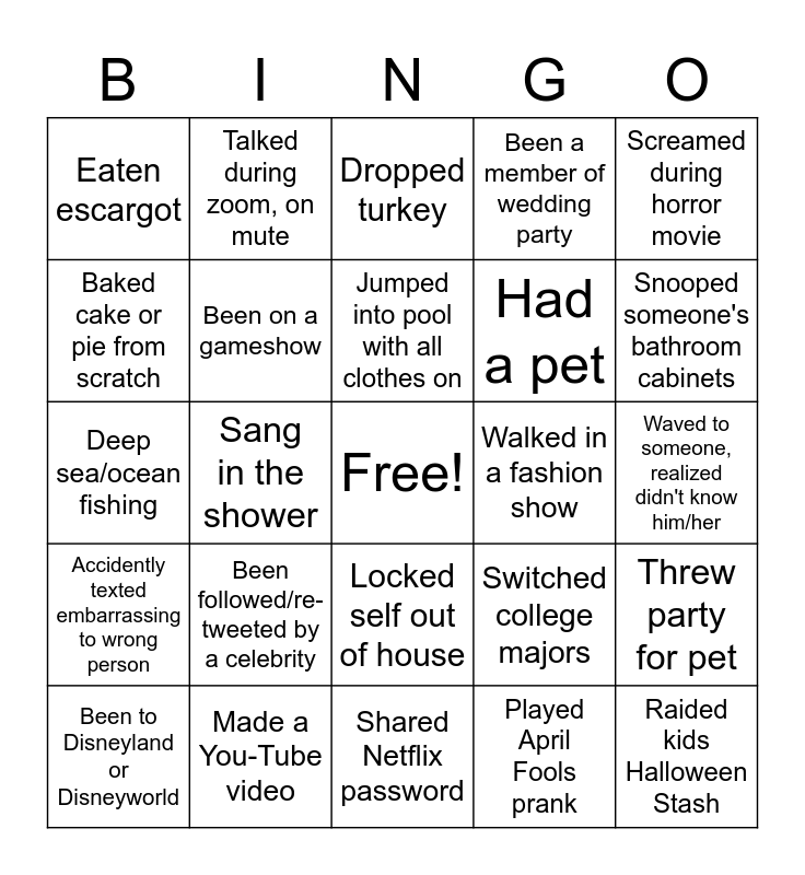 This bingo card has a free space and 50 words: Switched places with a twin, Raided kids Halloween Stash, Re-enacted "Lady & Tramp" kiss, Shared Netflix password, Been followed/re-tweeted by a celebrity, Worked all day in PJ's, Talked during zoom, on mute, Quit a job in 1 day or less, Baked cake or pie from scratch, Got a tattoo, Been on a gameshow, Been a member of wedding party, Threw party for pet, Switched college majors, Went to a rodeo, Skipped school, Jumped into pool with all clothes on, Walked in a fashion show, Camped out to get place in a line, Screamed during horror movie, Sang in the shower, Played April Fools prank, Eaten escargot, Had a pet, Hit someone's car, Hit a hole in one, Snooped someone's bathroom cabinets, Walked into screen/glass door, Dropped turkey, Locked self out of house, Pretended to text while waiting for someone, Tripped-looked to see if someone saw, Teared up - food too spicy, Threw up in someone else's car, Made a You-Tube video, Made a Tic-Toc, Re-gifted a gift, Lied to parents where I was going, Listen to Grunge Genre, Waved to someone, realized didn't know him/her, Talk to pets like they were human, Pulled prank on boss, Got in/opened wrong car in parking lot, Been to another country, Been to Disneyland or Disneyworld, Deep sea/ocean fishing, Rabbit hunting-any hunting, Been in a marathon, Accidently texted embarrassing to wrong person and Been to all 50 US States.