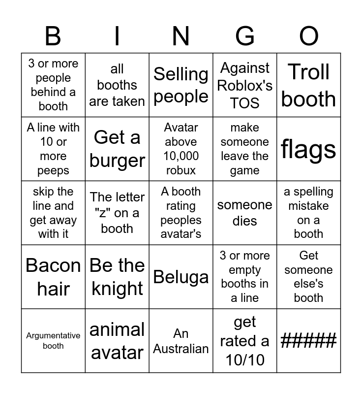 This bingo card has a free space and 24 words: Be the knight, animal avatar, Avatar above 10,000 robux, Argumentative booth, Troll booth, 3 or more people behind a booth, A line with 10 or more peeps, all booths are taken, someone dies, Beluga, make someone leave the game, skip the line and get away with it, 3 or more empty booths in a line, Get someone else's booth, Get a burger, get rated a 10/10, a spelling mistake on a booth, Selling people, flags, The letter "z" on a booth, #####, Bacon hair, Against Roblox's TOS and An Australian.